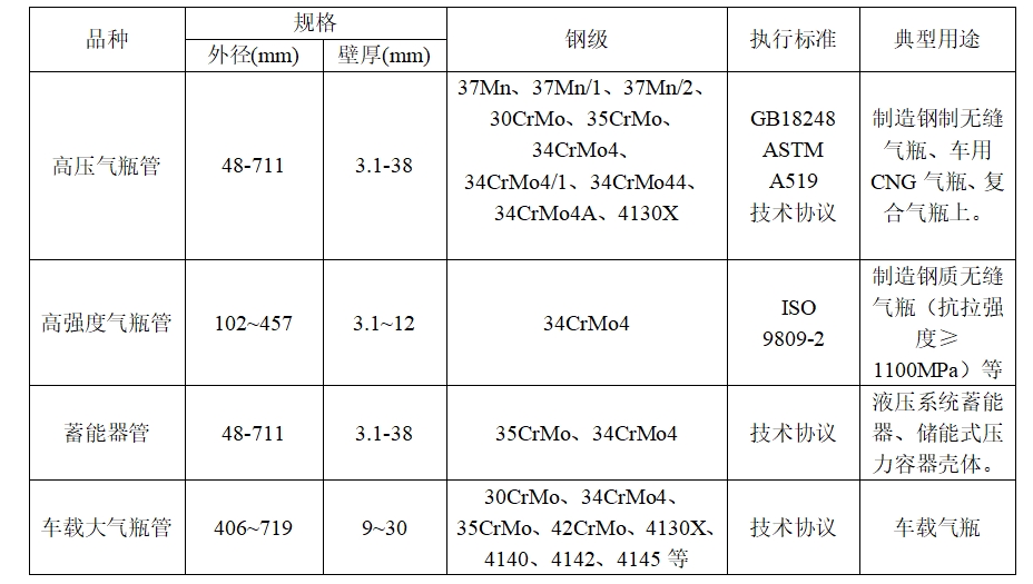 用于制造钢制无缝气瓶、车用CNG气瓶、复合气瓶。我公司生产的高压气瓶管为管制瓶制造提供优 质的热轧薄壁无缝钢管,具有内外表面质量好、壁厚均匀、质量轻、生产率和成材率高、成本低等优点,便于无缝管制瓶瓶底收口的关键技术的应用,使气瓶管的制 造从采用钢坯经冲孔拉拨转向采用薄壁无缝钢管制造,并已成为发展趋势,深受用户欢迎。