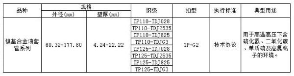 耐蚀合金油井管主要应用于高含硫化氢和二氧化碳的苛刻腐蚀环境。我公司已经研制出028、825和G3等镍基合金油井管并实现了批量生产和供货,满足了不同等级苛刻腐蚀环境的需求。目前,该系列产品已经广泛应用于川渝和西北地区以及海上油田。