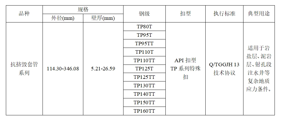 我公司开发的抗挤毁系列套管具有比API Spec 5CT同规格、同钢级套管更高的抗挤毁性能,适用于盐膏层、泥岩层以及油层出砂等特殊井况,抵抗极大外挤载荷或不均匀外挤载荷。TP系列高抗挤毁套管包括三个种类,一是API Spec 5CT标准规格系列的高抗挤毁套管;二是具有特殊通径要求的API Spec 5CT规格高抗挤毁套管;三是适用于岩盐层、盐膏层、泥岩层等复杂井况的非API规格系列的超高强度高抗挤毁套管。