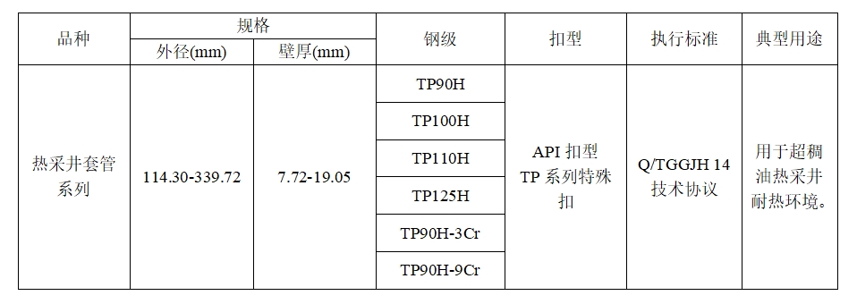 我公司根据注蒸汽、蒸汽驱稠油热采工艺,设计开发了TP系列稠油热采井专用套管,有效提高了注蒸汽作业温度下套管的屈服强度,保证了管串在高温下的密封性能。同时,针对近年来火驱采油工艺的逐渐推广,我公司设计开发了90ksi和110ksi高铬(Cr)系列热采井套管。该系列套管产品具备更加优异的高温强度稳定性及抗二氧化碳腐蚀能力,专门应用于火驱采油工艺,目前已经在新疆油田得到广泛使用。