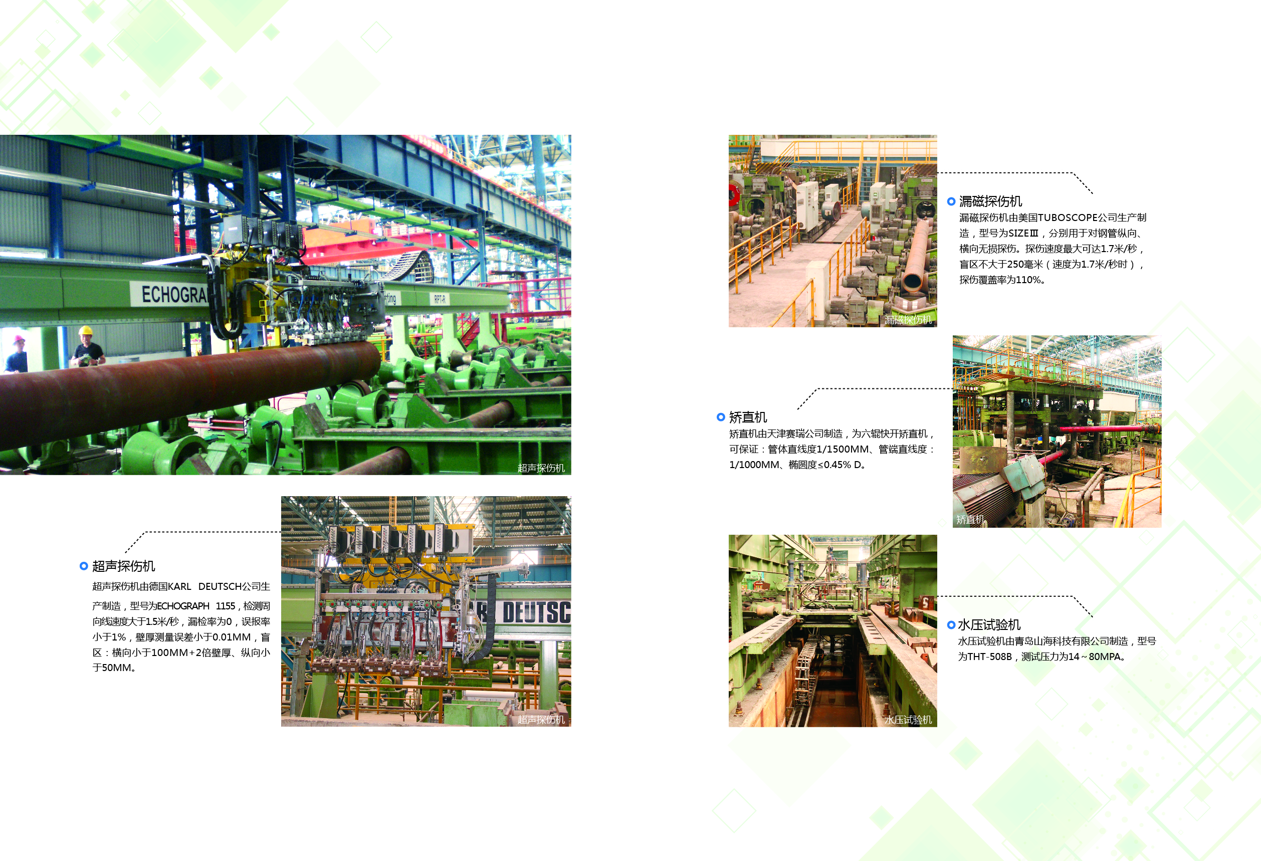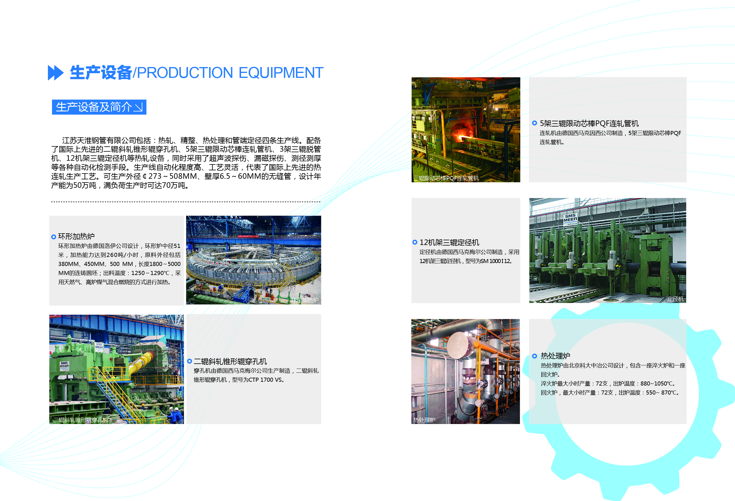 天淮公司坚持“高起点、高水平、高质量”的发展理念,投资近30亿元,建设超大口径PQF热轧无缝钢管生产线。该生产线配备了当前国际上先进的二辊斜轧锥形穿孔机、三辊限动芯棒连轧机、三辊脱管机及定径机等热轧设备,采用了具有自主知识产权的关键技术,同时采用了超声波、漏磁、测径测厚等一流的自动化检测手段。主体设备从德国、意大利和美国等进口,整个装备配置代表了当今国际上先进水平。